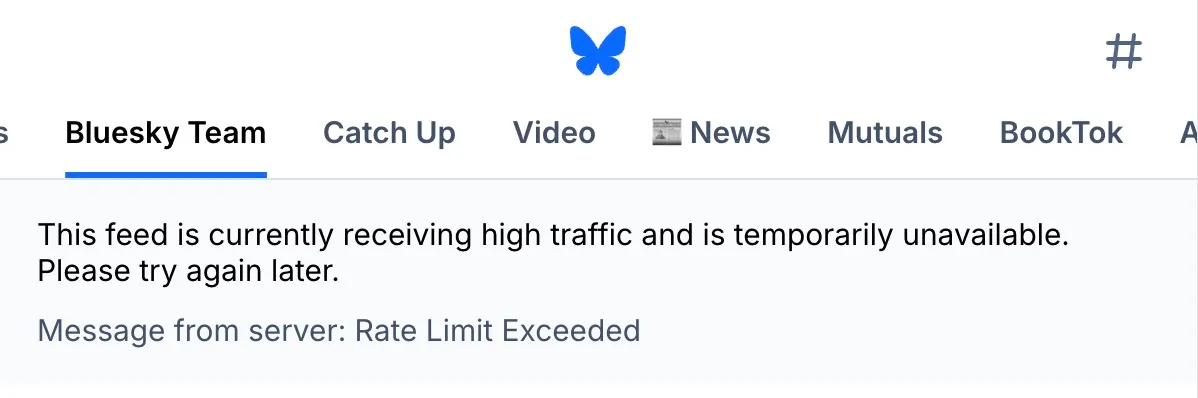 Popular feeds like Discover or the official Bluesky Team’s feed often see this problem, even as users’ own personal feeds are functional. Other times, like when trying to visit a user’s profile, the site will display an error message, forcing you to refresh and try again.