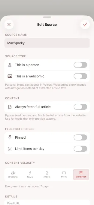It can fetch the full article text from the web even if the website itself is set to truncate its feeds (as many sites do to motivate people to visit), and you can mark sources as webcomics to unlock an image-first reader experience. You can also mute sources for a week and pin those you can’t miss to the top of the river.
